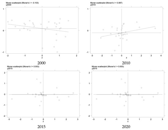 Moran scatter plot for 2000, 2010, 2015, and 2020. Drawn by the author.