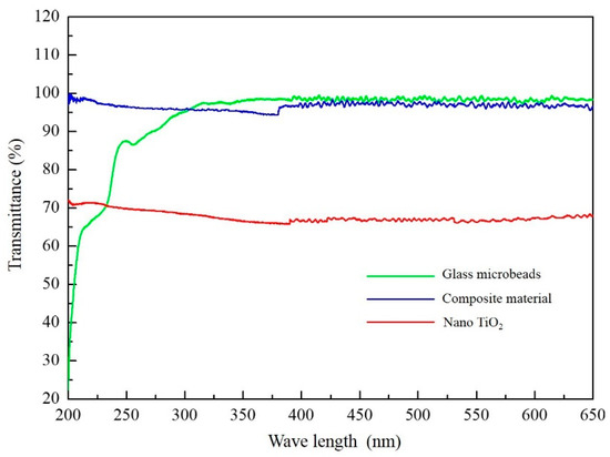 Glass microbeads are a chemically stable mixture and are usually used as a reinforcing agent for plastics. In addition, they have the properties of reflection and diffusion; as such, they are often used in road signs and pavement markings in the field of traffic to enhance light sources and warnings. This article focuses on the photocatalytic degradation rate of nano TiO2, for which sufficient light is a catalytic condition. This section focuses on a test of the light transmittance of nano TiO2 composites by UV-Vis Spectrophotometer. Figure 3 shows that the average transmittance of the glass microbead–nano TiO2 composite material is 94.5%, which is 26.7% higher than that of pure nano TiO2. The result shows that the composite material has stronger light transmittance than pure nano TiO2. It must also be mentioned that the blue line and the red line have a similar inflection point that appears around the wavelength of 380 nm, which offers additional proof of the successful production of the glass microbeads–nano TiO2 composites.