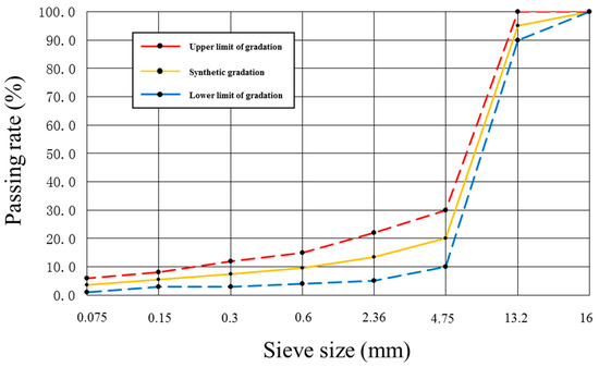 The gradation used in the design of the asphalt mixture in this paper refers to the relevant requirements in the “Technical Specification for Design and Construction of Perfusion Semi-flexible Pavement“ (DB11/T 1817-2021). The gradation composition and gradation curve of the base asphalt mixture are shown in Table 3 and Figure 4, respectively.