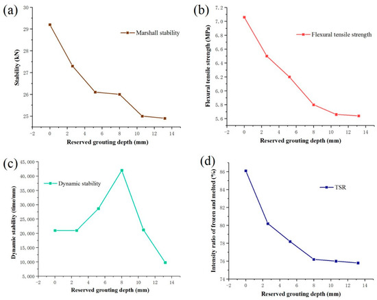 In order to obtain the best reserved depth of the specimens, we focus on a series of mechanical property tests for semi-flexible specimens with different reserved grouting depths, including Marshall stability, high-temperature stability, low-temperature crack resistance, and water stability. The test results are shown in Figure 5.