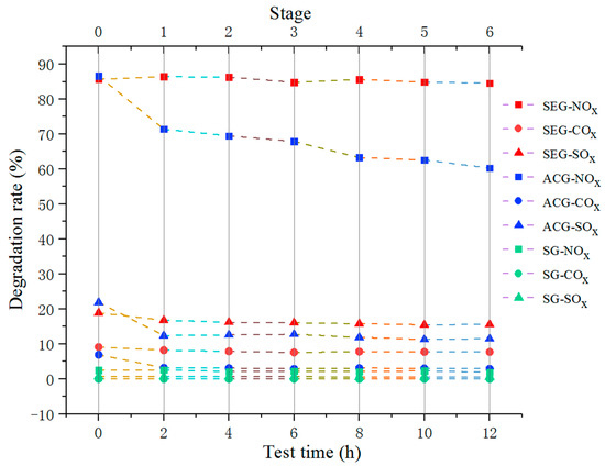 After the test specimens for different paving methods are tested, there are significant differences in the degree of degradation capacity. Figure 7 shows that the stirring group has a poor degradation efficiency of only 1.09%. This is because the composite material is mixed into the interior of the specimen, replacing the mineral powder, and, thus, cannot be exposed to the external light source to participate in the photocatalytic reaction. After the first stage of testing for the aqueous coating group, the degradation efficiency with respect to harmful gases, such as nitrogen oxides, carbon oxides, and sulfur oxides, decreases by 17.49%, 53.62%, and 43.25%, respectively. After the fourth stage, the degradation rate is gradually stabilized. The reason it still partially retains the ability to degrade exhaust is that some composite material is embedded in the surface texture of the asphalt mixture. In contrast, in the spray embedding group, the exhaust gas degradation rate is almost not attenuated for its good durability.