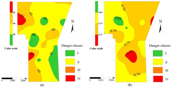 According to the comprehensive connection degree and risk grade evaluation results, the water inrush risk evaluation indexes (Table 5) of the coal seam roof in the 221 mining area are calculated by Equations (25) and (26), and the water inrush risk zoning map based on the combination weighting-set pair analysis discrimination model is drawn (Figure 5). Combined with the pumping test results of two boreholes in the study area (the unit water inflows of 1# and 3# are q = 0.005421 and q = 0.0741 L/s·m, respectively), the risk evaluation index E [0, 2] is defined as the safe zone; E [2, 3] is defined as the transition zone; and E [3, 4] is defined as the danger zone. According to the danger zoning map, the vast majority of the 221 mining area belongs in the safe zone, and small regions of transition zone and danger zone exist only in the central and northern portions of the mining area.