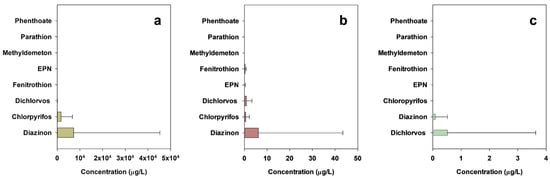 Average organophosphate pesticide (OP) concentrations in (a) agrochemical manufacturing facility (AMF) wastewater, (b) agrochemical wastewater treatment plant (AWWTP) influent, and (c) AWWTP effluent. Error bars indicate the standard deviation.