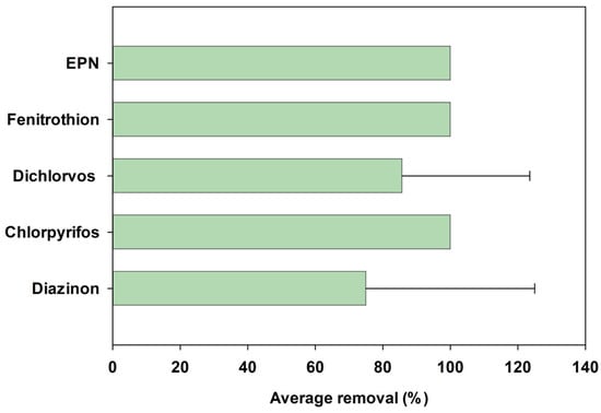 Average removal of organophosphate pesticides (OPs) observed in the agrochemical wastewater treatment plant (AWWTP) influents. Error bars indicate standard deviation.