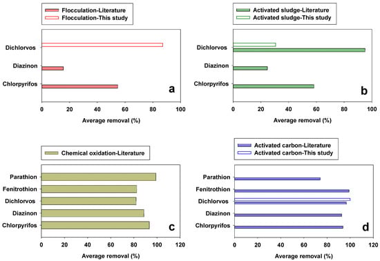 Removal of six individual organophosphate pesticides (OPs) (chlorpyrifos, diazinon, dichlorvos, EPN, fenitrothion, and parathion) using four unit processes. The literature cited for each unit process is as follows: (a) flocculation [24,31], (b) biological removal [8,9,35], (c) chemical oxidation [25,27,34,36,37,38,39,40,41,42,43,44], and (d) activated carbon adsorption [6,28,29,30,31,32,33,34,45,46,47,48,49,50].