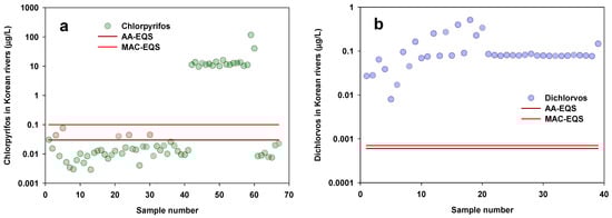 Concentrations of: (a) chlorpyrifos and (b) dichlorvos in national monitoring sites (NMSs) of South Korean rivers. AA-EQS and MAC-EQS indicate environmental quality standards in the EU, expressed as an annual average and maximum allowable concentration, respectively.