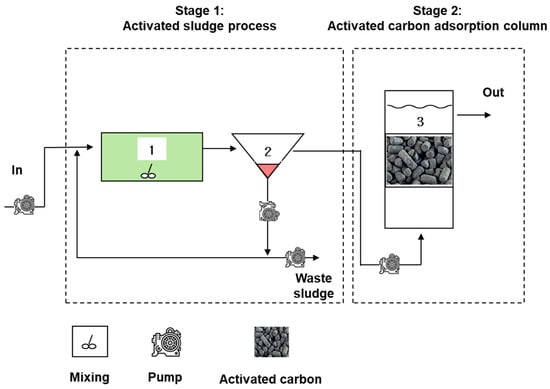 Application concept schematics of an agrochemical wastewater treatment plant (AWWTP) for treating organophosphate pesticide (OP)-containing wastewater. (1) Activated sludge reactor, (2) settler, and (3) activated carbon adsorption column.
