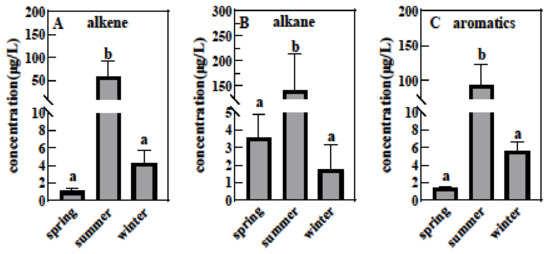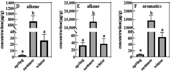 | Seasons | Samples | Alkenes | Nonparametric Tests | Alkanes | Nonparametric Tests | Aromatics | Nonparametric Tests |
