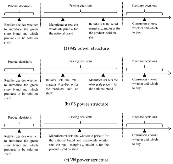 We assume that the introduction decision of a green store brand is a long-term strategy that cannot change as easily as the pricing [12]. Further, the store brand can be a credible threat, which may force the manufacturer to reduce the wholesale price of national brand only when it has been introduced [18]. Therefore, in our model, the introduction decision is made prior to the pricing decisions no matter what the supply chain power structure is. Then, in the next pricing game stage, we follow the previous literature [18,31,36,37], modelling the supply chain power structure as the different sequence of pricing decisions made by the manufacturer and the retailer. Therefore, the decision sequences can be translated into the following three games: