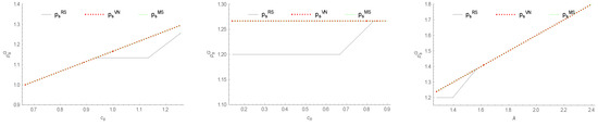 Next, we compared the three optimal profits of manufacturer derived from the above cases. Note that for any , we have . Hence, we derived the optimal wholesale price under different regions with respect to and as follows.