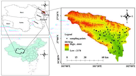Datong County, Xining City, Qinghai Province is located in the eastern part of Qinghai Province, Hehuang Valley (100°51′–101°56′ E, 36°43′–37°23′ N), the southern foot of Qilian Mountains, Huangshui River upstream of the Beichuan River basin, and is the transition zone of Qinghai–Tibet Plateau and Loess Plateau. Its elevation ranges from 2178 to 4444 m; the topography of the northwest is high and the southeast low. The study area belongs to the plateau continental climate, the maximum and minimum temperature are 35.6 °C and −26.1 °C, the annual average temperature is 4.9 °C, with the most precipitation being in August. The region has a typical highland continental climate with dry spring and humid summer.