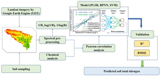 The technical roadmap of this study is shown in Figure 2. Firstly, remote sensing images were obtained from GEE, combined with actual soil sampling data after a series of preprocessing, and mathematically transformed the image band reflectance. Then, correlation analysis was performed to extract the feature bands to construct three prediction models, PLSR, BPNN and SVM. Finally, the model prediction accuracy was evaluated by the coefficient of determination (R2) and root mean square error (RMSE); the model with the highest accuracy was selected for total soil nitrogen spatial prediction.