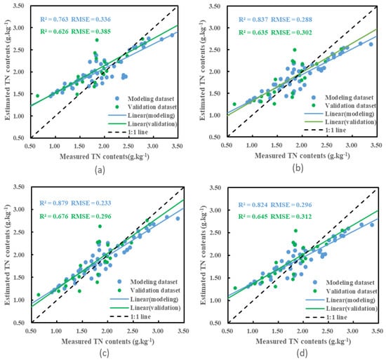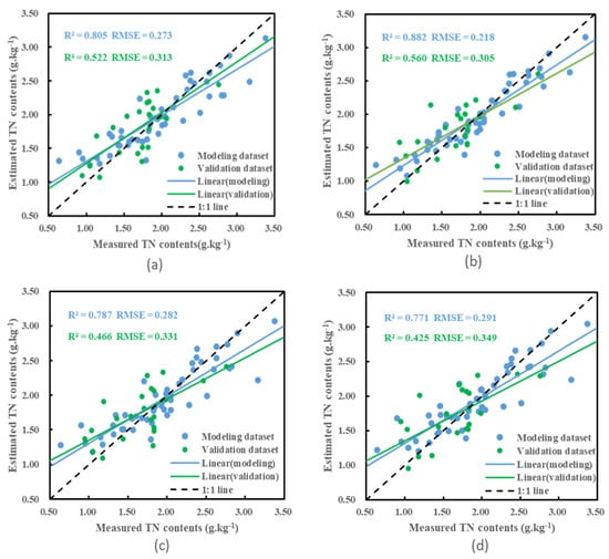 Meanwhile, a scatter plot of the model inversion results was plotted in this study (Figure 3). From the figure, it can be observed that the sampling points of the BPNN model built with the inverse of reflectance as the input variable are distributed around the 1:1 line and are more aggregated. Several other transformations from models also have TN spatial prediction capability, but the prediction accuracy is not very satisfactory, and the scatter plot is more scattered. Moreover, these models are suitable for the prediction of TN content in the range of 1.5 to 3.0 g/kg, beyond which the prediction accuracy is low. In general, the PLSR model has weaker prediction ability than the BPNN model, and the inversion results of the constructed BPNN model have less error and higher accuracy. The R2 of the validation dataset was less than that of the modeling dataset, which was probably due to the uneven distribution of TN at the sampling points and the small number of soil sampling points used for validation. In summary, the predictive ability of the 1/R model is high. Compared to the PLSR model, the nonlinear model has a greater advantage in terms of predictive power and stability, which is consistent with the findings of many scholars [3,34].