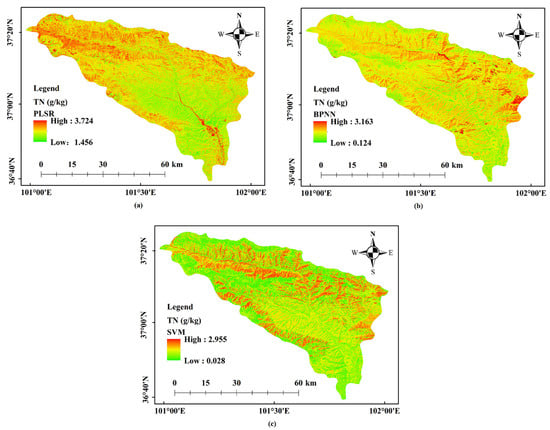 Predictive maps of TN using (a) PLSR; (b) BPNN; (c) SVM model.