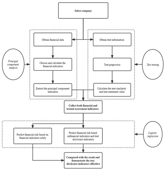 Based on the availability of financial data and company annual reports, a suitable number of listed companies are selected as research subjects. Combining financial and text disclosure indicators, an assessment indicator framework was established. Due to the excessive number of financial indicators, the original indicators were transformed into five leading indicators by using the principal component analysis (PCA) method to reduce the dimensionality. Text similarity and sentiment values were calculated using text mining techniques. To verify that adding text disclosure indicators will improve the prediction effect, financial indicators are used first in the logistic regression. Then, the regression will be combined with financial and text disclosure indicators. The results of the two regressions will be compared and analyzed to verify the validity of text disclosure indicators. The whole empirical research procedure is shown in Figure 1.