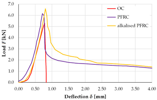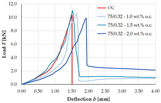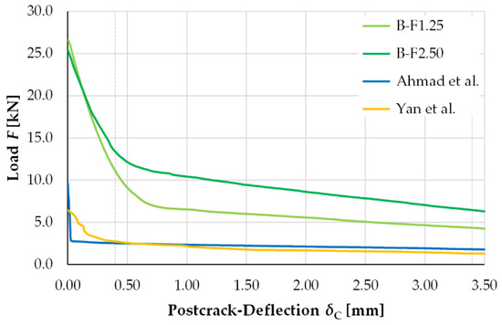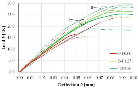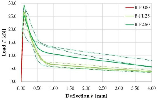 - The bamboo fibers were able to prevent the brittle failure of the UHPC and ensure ductile behavior by the crack-bridging effect. With deflection-softening behavior, the beams with a dosage of fibers of 1.25 wt.% o.c. (9.6 kg/m3) were capable of 11.3 kN (42.5% of the maximum load ) at a post-crack deflection of 0.4 mm, and at a post-crack deflection of 3.4 mm, 4.4 kN (16.4% of ), whereas the bending beams with a dosage of fibers of 2.50 wt.% o.c. (19.2 kg/m3) could support 13.6 kN (53.3% of ) and 7.0 kN (27.3% of ), respectively (Figure 10).