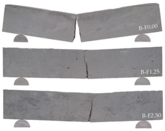 - The use of 1.25 wt.% o.c. (9.6 kg/m3) and 2.50 wt.% o.c. (19.2 kg/m3) bamboo fibers bridged existing microcracks and delayed macrocrack formation in the experimental tests conducted on UHPC bending beams. As a result, the maximum load could be increased by 37.1% and 30.9% (48.2%) from 19.5 kN to 26.8 kN and 25.6 kN (28.9 kN), respectively (Figure 8).