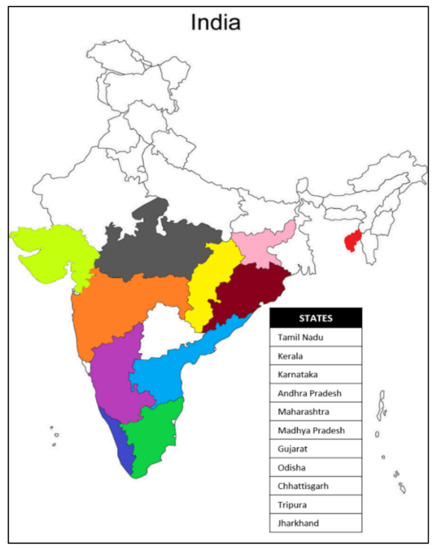 The present study was conducted in a seed source evaluation trial established at Forest College and Research Institute, Mettupalayam (11°19′ N; 76°56′ E; 300 m above MSL) and a seed source evaluation trial established at Punalkulam, Gandarvakottai (10°38′ N; 79°02′ E; 112 m above MSL), representing the western zone and Cauvery Delta Zone, respectively, during 2021–2022. The materials for the present study consisted of 30 seed sources (Table 1) collected from selected plus trees (the seeds were collected from a group of phenotypically superior trees (plus trees), which were selected based on the comparison tree method) of 11 different states, including Tamil Nadu, Tripura, Maharashtra, Odisha, Gujarat, Kerala, Karnataka, Andhra Pradesh, Madhya Pradesh, Chhattisgarh, and Jharkhand (Figure 1). Experimental research and field studies on teak, including the collection of plant material, complied with relevant institutional, national, and international guidelines and legislation.