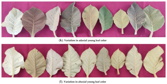 Variations in the (a) presence and absence of petiole, (b) petiole length, (c) shape of leaf base (variation in leaf vein color), (d) leaf texture attitude (horizontal and bending), (e) presence and absence of petiole, (f) leaf vein pattern, (g) adaxial leaf color, and (h) abaxial leaf color (i) presence and absence of leaf pubescence, (j) leaf attitude (horizontal and bending), (k) adaxial young leaf color, and (l) abaxial young leaf color.