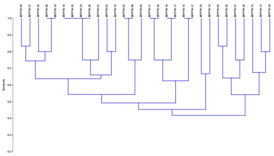 The clustering analysis was performed using the UPGMA method (Unweighted Pair Group Method with Arithmetic mean) by means of Past 4.03 software [10].