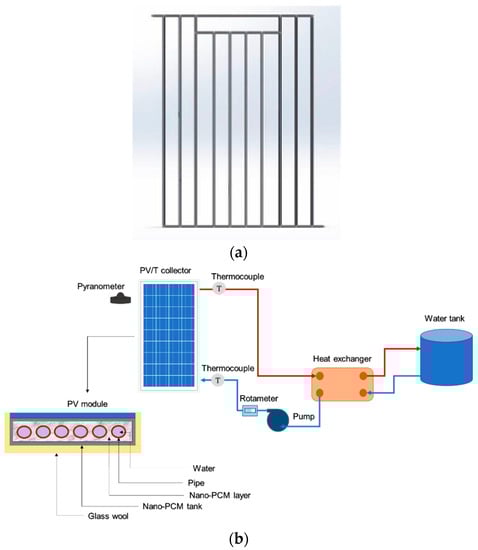 A container for the nano-paraffin was designed and prepared in a way that allows it to be attached to the back face of the PV panel. This container was built using galvanized iron sheets. Table 4 shows the used container measurements. Paraffin absorbs the accumulated heat in the PV panel in a uniform manner so as to prevent the formation of various heat loads on some areas of the panel. A direct flow heat exchanger of copper tubes was installed inside the container, and this type of heat exchanger was chosen because it draws heat uniformly from the nano-paraffin without leaving uncooled areas inside the container (Figure 2a). The same collector was attached to the back of another PV panel to cool it by circulating water. The paraffin container was insulated with glass wool (25 mm thickness) that covered all exposed sides of it to prevent heat from leaking from the thermal tank to the surrounding air (Figure 2b). Three PV panels, type STF-120P6, were used; the first is standalone, the second is a water-cooled PV/T system, and the third contains the nano-paraffin container and a water circulation exchanger. The PV modules used in this study had a maximum electrical efficiency of 14%, with maximum power ranges from 117 W to 123 W, an open circuit voltage of 20 V, and a short circuit current of 7.63 A. The PV panels were cast facing south at a tilt angle of 33°, based on the results of prior work by Al-Ghezi et al. []. In the experiments, two pumps were used to circulate cooling water for the second and third systems. The data acquisition system and a laptop computer were used to monitor and record this data. The practical experiments were conducted outdoors on the roof of the Energy and Renewable Energies Technology Center of the University of Technology, Baghdad. All measurements and data for the three systems were read and continually recorded at the same time. It is worth noting that the energy consumed by the two pumps was not included in the calculations of the performance of the systems.