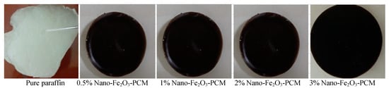 The process of preparing nano-paraffin is an important process that has been studied in depth and depends on many variables that must be taken care of in its selection [,]. First, it is preferable to heat the nanoparticles in an oven to get rid of moisture and to prevent the particles from clumping during mixing. The nanoparticles’ mass fractions were weighed in the sensitive scale and gradually added to the molten paraffin at a temperature at least 10 degrees above the melting point, as indicated in []. The sonication process is used to mix and spread nanoparticles in hot paraffin and prevent their agglomeration. The importance of this process is great, and it determines the stability of the paraffin nanoparticles. In this study, the results from the study of Chen et al. [] were adopted, and three and a half hours was chosen as the sonication time for all mixtures. When the color of the white paraffin is completely changed, the success of the mixing process can be confirmed. In the current experiments, the paraffin color changed to black without impurities (Figure 3). This change means that the nano-Fe2O3 is uniformly diffused inside the paraffin and bound to its molecules.