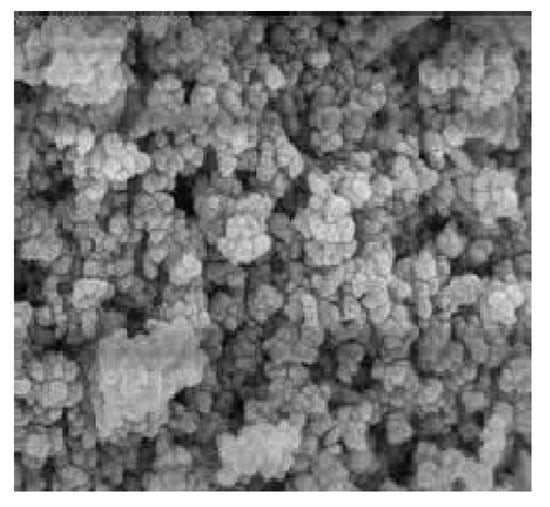 The scattering and absorption of light for any material expresses its components, and its change means a change in the structural properties of the material. Paraffin consists of chains of hydrogen and carbon with a crystalline structure affected by the interference of nano-Fe2O3, as the composition of the molecular structures of the mixture changes. The SEM image of nano-Fe2O3 is shown in Figure 4. This image shows that the nano-Fe2O3 used is spherical in shape, that it ranges from 30 nm to 50 nm in scale. The shape of the nanoparticle and its measurements greatly affect the thermophysical properties of the nano-paraffin product, as explained by reference [].