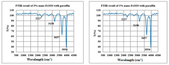 Figure 5 shows the result of the FTIR assay for a nano-paraffin composite material of two nano-Fe2O3 mass fractions with additions of 1% and 3%. The strong vibration effect appears in the form of sharp peaks as in 3657, 3954, 3158, and 2227, which show that the paraffin structure is vibrating. The absence of a slight peak adjacent to a large peak indicates that the vibration is symmetric. From observing the differences between the two samples, no other peaks appeared, which means that no chemical reaction occurred between nano-Fe2O3 and paraffin.