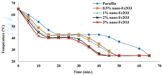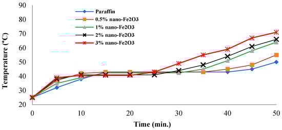 In thermal storage applications, the charging and discharging processes are very important, as they are the main engine for absorbing heat energy on the one hand and transferring it to the other side. These two process determine the storage time for the potential energy. The faster these two processes work, the better the performance of the application that contains them. Figure 6 shows the effect of nano-additives on the charging time of paraffin when heated. Charging and discharging experiments were carried out in the same nano-paraffin tank. The tank was left in the charged state without water circulating through the paraffin (it was left to heat for 65 min). In the case of discharging, cold water at 25 °C was circulated for 65 min. Figure 6 shows that the paraffin melting process (time during which all paraffin turns molten) is about 25 min, and its melting point is at 43 °C. When adding nanoparticles to paraffin, the melting point decreased partially with an increasing mass fraction of nano-Fe2O3. It became 43 °C, 42.2 °C, 40.7 °C, and 40.2 °C for added mass fractions of 0.5%, 1%, 2%, and 3%, respectively. Additionally, the charging time was reduced from 25 min for the case of paraffin to become 20, 20, 15, and 15 min for the case of adding a mass fraction of 0.5%, 1%, 2% and 3%, respectively. The charging time of nano-paraffin is affected by the thermal conductivity of the samples and the higher conductivity, the shorter charging period, and the lower the melting point. This result was confirmed by the references [,,]. The phase change period for paraffin takes longer than in the case of nano-paraffin, because the solid layer that faces the heat flow acts as an insulator that prevents heat transfer to the layers that follow when it is heated. In the case of high conductivity by adding nano-Fe2O3, the charging process accelerates the transfer of heat through the paraffin layers directly and without obstacles. After completing the paraffin and nano-paraffin phase change to liquid, their temperatures increased, which in turn increased the thermal energy stored in the material as sensible heat. Through the phase change operation, the stored energy is latent heat. During the phase change period, the temperature of paraffin and nano-paraffin remains at the melting point until all of the paraffin is completely melted. The phase shift (from solid to liquid) allows nanoparticles to move through the fluid, and this causes its convergence, coalescence, and then precipitation. Therefore, if the distribution of these particles is irregular and the distances between them are close, their accumulation will facilitate a rapid decrease in the stability of nano-paraffin. Is there a guarantee to prevent such a situation? The only guarantee is to take care during the mixing process of paraffin and nanoparticles, and by choosing the type of nanoparticles added and the mass fraction added. The smaller the particles, the better the diffusion process, and the smaller the added quantity, the greater the spacing between the particles, both of which ensure that the stability of the mixture is not lost during the charging and discharging processes. Additionally, during the system operation and the repetition of charging and discharging operations, if the time period for these two processes is longer than its condition in the first days of operation, this means that the composite material has begun to lose its stability and must be unloaded and re-mixed. During the practical tests, charging and discharging operations occurred more than 70 times, and no clear change was observed in these processes’ timings.