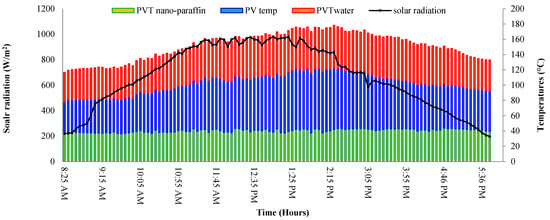 Figure 8 shows the relationship between daily operating hours, solar radiation intensity and PV temperatures for the three tested systems during the study period (July and August 2021). This period of the year sees the most severe weather conditions in all of Iraq, and in Baghdad in particular. In addition, the intensity of solar radiation rises to high levels (above 960 W/m2 in the middle of the day) []. This radiation intensity is close to measurements made in the sun belt region (Oman [], UAE [], and Saudi Arabia []). It can be seen that the high radiation intensity leads to an increase in the temperature of the solar panels to high levels. Since the ambient temperatures in the sun are also high, cooling these panels naturally is out of the question, and PVT systems should be used to achieve good cooling. The measurements showed that the average temperature of the standing PV system rises to high levels, reaching more than 80 °C at noon. For a water-cooled PVT system, the temperature of the panel is lower than 50 °C (the maximum PV temperature achieved). For the case of the nano-paraffin PVT system, the temperature of the PV panel was reduced to less than 43 °C (the maximum temperature reached by the PV panel). These measurements confirm the possibility of using PVT systems with nano-paraffin in the cooling of photovoltaic modules. During a whole day operation, the temperature decreased about 20.45% and 34.66% when using water cooling and water-cooled nano-paraffin, respectively. The use of water in cooling the PV modules can be considered efficient (certainly not in the capabilities of the nano-paraffin PVT systems), especially if the costs of the system and the availability of water is included in the calculations. Chaichan et al. [] proved that in the area of Baghdad, underground water (which is available at levels not exceeding 10 m) can be used to cool PV systems with high efficiency, because the temperature of this water does not exceed 20 °C in summer or winter. For nano-paraffin PVT system, when cooled by water (while the composite material remains at temperatures higher than the solidification temperature) especially during noon times, the cooling efficiency is high. It is noted that the temperature curve for this system is more moderate than the rest of the curves as an indication of high cooling efficiency.