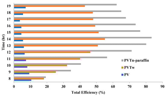 Figure 9 shows the overall competencies of the three studied systems. For a conventional PV system, this system has only electrical efficiency, and this efficiency decreased under the conditions of overheating of PV modules. Therefore, a significant difference is observed between it and the PVT systems. Water is a traditional cooling fluid, so improving the efficiency of the heat exchanger tends to enhance the heat transfer process. In general, the overall efficiency of the nano-paraffin system is very high. A large proportion of heat accumulated in the photovoltaic panel was absorbed by the nano-paraffin cooling system and converted into useful thermal energy. Additionally, this effective cooling of the PV panel led to higher electrical efficiency. The improvement in the total efficiency was about 576.6% and 832. It was 14% for each of the water-based and nano-paraffin PVT systems, respectively, compared to the standalone PV system. The highest total efficiency reached by the nano-paraffin system was 83.43% at two o’clock in the evening, which means that at the most difficult times in terms of weather conditions, the highest solar radiation and ambient temperature increased the efficiency of the system, while in the case of the PV panel, the efficiency decreased to its lowest levels. According to the results, it can be said that the use of nano-Fe2O3 added to paraffin is an appropriate and acceptable option.
