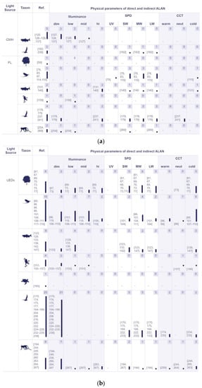 Figure 8. (a) Reported physical parameters per organism group for different (single) CMHs and FLs. See the main text for details on categories. (b) Reported physical parameters per organism group for different (single) LED light sources. See the main text for details on categories. (c) Reported physical parameters per organism group for different (single) HPSs. See the main text for details on categories.