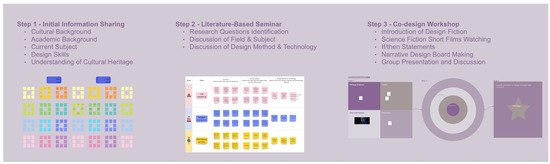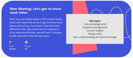 Peer sharing had played a significant role in familiarising participants with each other, as well as with their design expertise/skills, and specific interests in heritage (e.g., tangible or intangible heritage) and emerging technologies (e.g., VR, AI). Currently, peer sharing has not been specifically discussed in the majority of design fiction literature or studies [38], however, peer sharing as an experimental activity achieved some positive results. The first activity not only provided a space that supported participants in exchanging design skills, but also supported them in forming their initial understanding of cultural heritage and the relevant emerging technologies from their mixed design background/perspective. In addition, after all design activities had finished, some of the participants mentioned that the peer sharing activity (starting from a design-based discussion) helped them build up a comfortable environment for discussion, enabling them to discuss various relevant topics, rather than going straight to exploring the futuristic perspectives which may have confused their understanding. It also gave the facilitator an explicit idea about how to allocate the participants to different groups and enhance their in-depth knowledge of heritage studies and digital heritage. Kinch et al. [38] mentioned that creating a comfortable and collaborative environment would support participants and stakeholders in familiarising themselves with and immersing themselves into a certain topic [39]. Furthermore, the preparation behind creating this immersive environment in a fiction-based design research project is also necessary and significant, especially as most of the participants were not familiar with a fictional co-design working environment. Specifically, Step 1 in Figure 1 outlines that this study adopted five components (cultural background, academic background, current subject, design skills, understanding of cultural heritage) to expand the exchanging of skills step by step. The graphic demonstration on Miro also visually illustrated every process within the discussion between the participants.