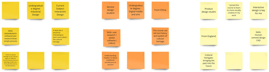 The first activity familiarised the participants with each other, while briefly outlining their relevant design skills. This activity was conducted on Zoom and Miro. Zoom provided a platform for communication, and Miro supported participants’ interaction and demonstration of ideas. They were all given 30 min to work on a Miro board to present themselves on five parameters: cultural background, academic background, current subject of study, design skills, and their personal understanding of cultural heritage (Figure 1). This was followed by a 5–10 min talk by each participant, wherein they summarised their notes from Miro to talk about themselves. Figure 2 presents the keywords used by the participants to clearly explain their thoughts on the key parameters. Based on their personal design skills and particular interests in cultural heritage (as mentioned by them), the author, in the capacity of a design facilitator, divided the participants into six groups for the second activity.