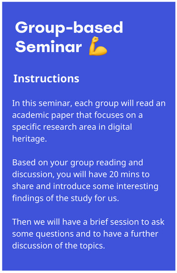 The literature-based seminar took a research-based approach (by drawing on the literature from digital heritage, heritage studies, and computer science), and utilised academic papers to encourage participants to expand their understanding of cultural heritage and relevant emerging technologies. This method has been utilised frequently in interdisciplinary academic projects and research-based teaching practice within digital civics to help researchers/designers from different disciplines work together on the same topics [40,41]. As an advanced and secondary step, the literature-based seminar further creates a pre-co-design context that enhances the relevant knowledge of emerging technology for the participants. Instead of using a tutorial or lecture-based seminar, this method offers more flexibility and autonomy for participants to actively explore the potential of relevant case studies, which in turn can build up their inclusive understanding of cultural heritage and emerging technologies [42]. More importantly, it provides a knowledge-sharing context that benefits all the participants. The various themes of these papers meant that participants from different groups were provided with the space to exchange their findings and understandings of a certain technology or heritage subjects. Furthermore, it is important to bridge actual and possible worlds with real and fictional worlds in design fiction [1,43]. Thus, this seminar was broken down into and delivered through three components to engage and help participants gain a comprehensive understanding of the relevant literature. Specifically, these components summarise research questions to help the participants grasp the focus of the literature, identify research fields and subjects to enhance the conceptualisation of potential research findings, and discuss the relevant design methods and techniques to build their own understanding of certain topics. More importantly, the seminar provided an in-depth knowledge-sharing space wherein participants could share their group findings gained from a certain topic and hold critical discussions with other group members to further explore and exchange relevant methods and technologies from different topics. From this study, one of the potential ways to progress or push the development of this bridging is to further improve or enhance the forecasting of a certain subject (in this study the subject is focusing on future heritage design), especially as most participants were not heritage specialists [44,45]. However, the process of group-based knowledge sharing was impacted to a certain extent owing to the paucity of time; not all participants could read all the papers, which kept them from acquiring comprehensive insights and robust findings. However, feedback from the participants revealed that if the academic papers were shorter or if posters were used instead, those whose first language was not English and struggled to finish reading within the allocated time would understand the key findings of some papers easily.