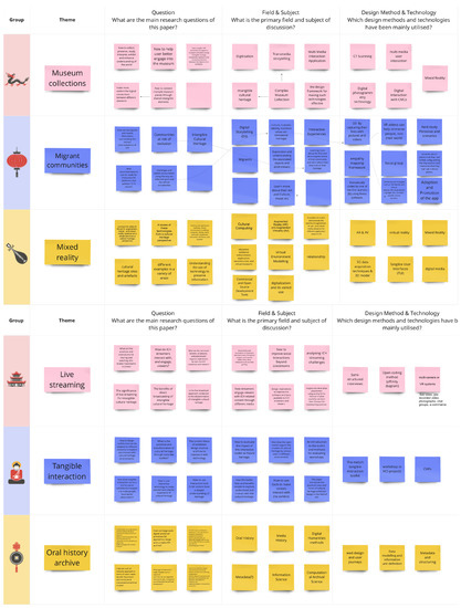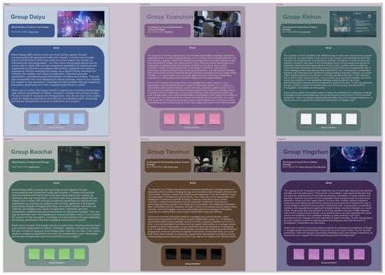 Most participants had neither direct professional knowledge nor experience of heritage studies or digital cultural heritage; therefore, the second activity intended to build upon and expand their understanding of both cultural heritage and relevant emerging technologies. The participants were divided into six groups (Daiyu, Yuanchun, Xichun, Baochai, Tanchun, and Yingchun) to enable the seminar to be conducted based on the reading of six research topics/papers (one per group), in order to explore emerging technologies within cultural heritage. The papers included in the seminar were collected prior to the seminar by the author using three major databases: ACM, Scopus, and Web of Science. These papers were chosen as they discussed and illustrated various types of emerging technologies, which are highly resourceful in enabling the participants to comprehend current technological developments as well as case studies and research in academia, thus enabling them to speculate on the future of heritage. Additionally, they were of high research impact and had gathered a significant number of citations within the field. Each research paper represents a specific topic that includes tangible interaction [20], live streaming [21], oral history archive [19], museum collections [35], migrant communities [36], and mixed reality [18]. A week before the seminar, each participant was provided randomly with one of the six papers and given a week to read it and make individual notes. During the seminar, each group was allocated an hour to share their understanding of the paper within their groups. Figure 3 presents the basic instructions and guidance for this seminar, which were conveyed through Miro. In addition, the groups were asked to base their discussion on three specific aspects: research questions, field and subject, and design methods and technology. The use of the Miro board allowed participants to record notes to supplement their discussion and document relevant findings. Figure 4 presents the three questions that inaugurated the group discussions and notes taken by each group. These three questions were: (1) “What are the main research questions of this paper?” (2) “What is the primary field and subject of discussion?” and (3) “Which design methods and technologies have been mainly utilised?” After the groups had finished their discussions, each group was allocated 20 min to share their understanding and findings of the specified topics, after which the other groups could raise questions about the topics discussed.