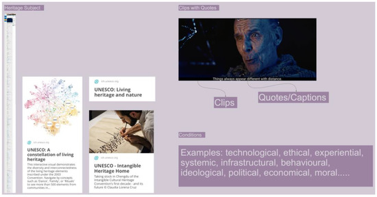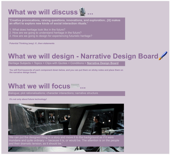 For the workshop, participants were placed in the same groups as in the previous stage (Activity 2: Literature-Based Seminar). The design activity required making a ‘narrative design board’, as shown in Figure 6. This board consisted of four key components: heritage subjects, topics, clips with quotes, and conditions. Each group could select one or more heritage subjects for further discussion and exploration; participants discussed the specific topics they wished to focus on with their group members (e.g., community-based or cultural education). To further facilitate the participants’ development of ideas regarding futuristic heritage design, the author provided ideational materials; these materials took the form of science fiction short films gathered from the popular YouTube channel ‘DUST’ (https://www.youtube.com/c/watchdust, accessed on 8 August 2022), which publishes thought-provoking science fiction short films through the lens of science and technology’s impact on the future of humanity. Each video allocated to the groups was 10–15 min long. Each group was provided with a random video link to one of the short films; the chosen films did not have any connection with the briefs. This was to avoid creating any subjective perspectives or barriers to restrict speculation. The films’ dialogues, plots, stories, and references to any emerging technology would have to be incorporated into their discussions and ideations. Figure 7 presents the briefs given to each group, alongside a detailed introduction. Finally, the participants could select additional key words (e.g., ethical, experiential, systemic, infrastructural, behavioural) for describing the conditions they identified and specified with their design ideation. In addition, a series of supplementary documents were provided, so that participants could better understand how to engage in the workshop, as presented in Figure 8 (these included resources and webpages for an in-depth understanding of heritage categories, and the use of clips from the science fiction short films to support their design ideations). It is worth noting here that the author has not defined heritage within this study. Supplementary materials around heritage itself were provided to the participants in order for them to form their individual and group understandings of heritage, exclusively.