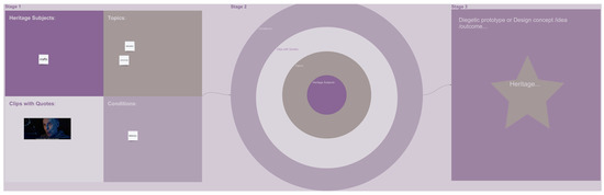 Future Heritage Design Workshop was the main component of this design study, as it intended to develop the participants’ performance in co-design activities, for exploring futuristic heritage design. The workshop utilised five components to support participants in exploring the future heritage experience. At this stage, design fiction was introduced to the participants by interpreting its concept and a series of open-ended questions were presented. These questions included (1) “What does heritage look like in the future?” (2) “How are we going to understand heritage in the future?” (3) “How are we going to design future heritage experiences?” These questions can potentially help participants to form an initial understanding of design fiction and think further about how to conduct creative provocations as well as raise research questions, innovations, and explorations of further heritage experiences. Moreover, the ‘if/then’ statements and ‘narrative design board’ could also construct a framework of how to practically adopt design fiction into the design activities [46]. The narrative design board effectively guided the participants into thinking about futuristic heritage design from multiple perspectives (e.g., heritage subject, topics, clips with quotes, and conditions). It was also a good medium for reflecting their understanding of the previous two activities and integrating them with the co-design phases. Meanwhile, the digital supplementary materials also played a significant role in supporting the participants in gaining relevant knowledge from their design activities [47]. The narrative design board includes three key stages as a process of unpacking and synthesising what participants found from their understanding (see Figure 10). The first stage was to map out their initial findings into four different areas (Heritage Subjects, Topics, Clips with Quotes, and Conditions). From this stage, they could then later synthesise through stage two by utilising the target board to narrow down their key findings to generate a logical direction. The final stage was to then document their design outcomes, which could range from anthropological short stories, imaginary video clips, or rapid user interfaces. This process specifically helped participants to shape their ideas from multiple dimensions as well as allowing them to demonstrate their design ideas visually from a design fiction perspective. The narrative design board is just one of the interpretations of utilising design fiction in co-design activities which will be beneficial and adaptable to future researchers in a heritage setting. During the workshop, particularly when the participants were discussing the heritage subjects, digital materials were frequently being utilised. Moreover, science fiction short films imparted knowledge of certain emerging technologies, and also inspired the ethical, behavioural, and ideological thinking necessary for designing futuristic work. Design fiction is not only limited to simple speculation of what is going to happen tomorrow, but also facilitates and affects the collaborative creation of a specific topic or theme and potentially shapes a futuristic trend of technologies. Supporting and enhancing the participants’ ability to gain insights is also vital, especially in the context of the crossroads of heritage studies and human–computer interaction. In this study, design fiction was integrated into a co-design working context to depict imaginary technological tools, as well as offer narrative critical perspectives with emerging technologies regarding how to design the heritage experience in the future. It also provided a space for participants to co-think, explore, and design sustainable future experiences using technology in a heritage-based context. More importantly, the uncertainty and ambiguity of human heritage and social values would also be discussed and developed in this space. The potential design outcome could be embodied as anthropological short stories, imaginary video clips, or rapid user interfaces. On the other hand, the usage and duration of the selected science fiction short films could be further adjusted. Some participants reflected that these films had in turn limited their thoughts by restricting it to the use of few technologies only. Thus, the use of science fiction short films in the future would require a more detailed introduction and specific practices to overcome this challenge. To summarise, all three activities demonstrate the necessity of the constant re-evaluation, amendment, and critique of ways of exploring speculative, experiential, and immersive futuristic thinking.