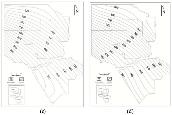The 1st–4th trend surface analysis results of No. 3 coal seam. (a) Results of the 1st trend surface analysis of No. 3 coal seam. (b) Results of the 2nd trend surface analysis of No. 3 coal seam. (c) Results of the 3rd trend surface analysis of No. 3 coal seam. (d) Results of the 4th trend surface analysis of No. 3 coal seam.