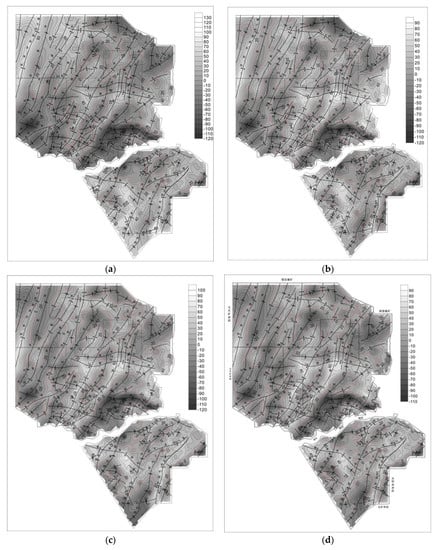 Figure 3 shows the residual analysis of mining areas first–fourth. In the residual plot, red lines are used to mark the isoline with a residual value of zero. By comparison, it is consistent with the contour of the coal seam floor. The residual map shows the overall structural characteristics of the mining area. The secondary fold developed on the SW inclined monoclinic structure is the main structural form. However, by distinguishing the positive and negative values, the latter more clearly depicts the development of anticlines and synclines, and is more clear for analyzing the development scale and influencing range of folds.
