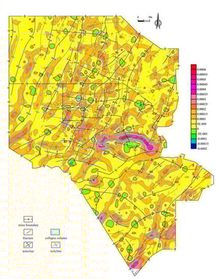 The value range of average curvature is between −0.00024 and 0.00032, and the curvature value is relatively small. The average curvature of most areas is concentrated around 4 × 10−5. It indicates that the bending degree of the coal seam is relatively small. It is consistent with the small inclination of the actual coal seam. In the average curvature map, the curvature value in the northwest is generally small and the change range is not large. The average curvature interval is between −0.000025 and 0.000025, and the contour is striped and equidistant. The variation range of the eastern curvature value is significantly increased, and the variation range is between −0.001 and 0.0015. In the central and southern regions, there is a near EW direction average curvature variation zone. The contour lines around them are mostly beaded. Even the maximum and minimum values of the average curvature are 0.00035 and −0.00025, respectively. The overall mean curvature of the south does not change much, and is mainly concentrated in −0.000025 to 0.000025. However, there is a significant change in the average curvature of the southeast region. The average curvature range is between −0.0001 and 0.0002.