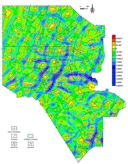 It can be seen that the residual values are in good agreement with the folds in the mining area after analyzing the first–fourth residual maps. The syncline is negative, and the anticline is positive. The residual change caused by structural superposition is very obvious. With the increase in fitting (Nc), the high-order residual map shows the structural morphology of the study area more clearly and in detail. The fourth order residual map is more obvious than the first order residual map, which is mainly manifested in the western part of the study area. For example, the Lujiazhuang anticline and the Huyuxi syncline in Shiziping show a negative and positive trend in the fourth order residual map, while the first order residual map is all above the line zero. Other places, such as Fowa anticline, northeast edge area and S15 syncline of No. 2 Coal Mine, also have similar situations.