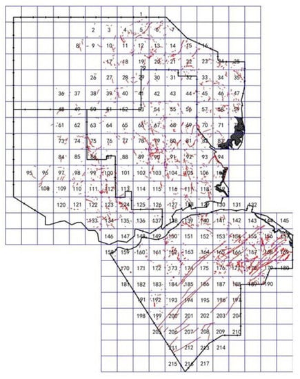 According to the fracture data on the coal seam mining engineering drawing (Figure 9), the grid covering method is used to count the fracture structure in the study area and calculate the capacity dimension. On this basis, the fractal dimension contour map is made to evaluate the complexity.