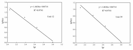 According to the side length of 1000 × 1000 m, 500 × 500 m, 250 × 250 m and 125 × 125 m, the well-field tectonic units are divided into several grade grids. The number of grids containing fracture traces in each unit is counted. The analysis of double logarithmic linear regression results is shown in Figure 10. Based on the capacity dimension and coordinate of each unit center point, the data are interpolated and encrypted by the Kriging interpolation method. The plane distribution of fracture capacity in Figure 11 is obtained. It can be seen from the diagram that the fracture capacity dimension value basically reflects the complexity of the fracture structure of No. 3 coal seam in the study area. The capacity dimension of the well-field fracture is mostly between 0.6 and 1.6, which indicates that the complexity of the well-field fracture structure has obvious indigenous heterogeneity. From the analysis of the complexity of the fault structure of the whole mine, it can be seen that the fractures in the dense development area of the fracture structure in the southeast of the study area are the most developed and dense. The fractal dimension contour reaches two. There are also four areas where the fractures are more densely developed. The fracture structure development in other areas is relatively simple.