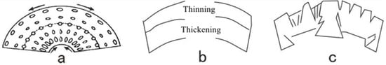 A single rock layer or a set of rock layers bonded firmly to each other will appear as a neutral surface under the action of longitudinal bending fold. The rock layer has completely different stress states on the neutral surface and below, as shown in Figure 12. The fold strata above the neutral plane of anticline are subjected to tension. The thickness of ductile strata becomes thinner, while the brittle strata generate tensile fracture surfaces. The fold strata below the neutral surface of the anticline are squeezed. The ductile strata move and thicken to the core of the anticline. The brittle strata produce compressive fractures. The stress condition of syncline is opposite to anticline. In addition, the stress effect on the anticline and syncline increases with the increase in the distance from the rock stratum to the neutral plane [42,43,44].