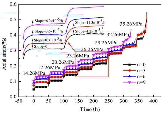 - Zhao, Y.L.; Zhang, L.Y.; Wang, W.J.; Wan, W.; Li, S.Q.; Ma, W.H.; Wang, Y.X. Creep behavior of intact and cracked limestone under multi-level loading and unloading cycles. Rock Mech. Rock Eng. 2017, 50, 1409–1424. [Google Scholar] [CrossRef]