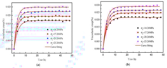 Zhao et al. [37] suggested that the creep properties of rocks can be studied by separating the viscoelastic and viscoplastic creep. According to the element theory, the viscoelastic creep of rocks is a stress-dependent function. By establishing a function of viscoelastic creep of the rock and stress under low axial compression and substituting it into Equation (2), the viscoplastic creep of the rock at high axial compression can be separated.