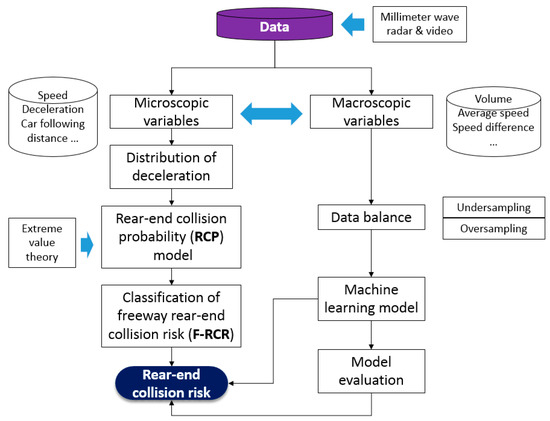 In order to fulfill the research gap, we first developed the rear-end collision probability (RCP) model based on the distribution of the deceleration. The sum of the collision probability of rear-end is defined as the freeway rear-end collision risk (F-RCR) to indicate the rear-end collision risk of the road. The F-RCR was divided into three classes, which were the high, median, and low rear-end collision probability. The high F-RCR indicates high rear-end collision risk on the freeway. Then, different machine learning algorithms were used to model the F-RCR under the condition of an unbalance dataset. The research framework is shown in Figure 1.