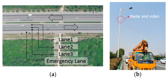 The length of the experiment road was about 1 km, with 3 lanes and 1 emergency lane. The lane width was 3.75 m, while the emergency lane was 2.5 m wide. The lane number was set as lane 1, lane 2, and lane 3 from left to right along the vehicle’s driving direction. Lanes 1 and 2 were primarily for passenger cars, whereas lane 3 was primarily used by heavy trucks. The speed limits on this road were 100–120 km/h in lane 1, 80–100 km/h in lane 2, and 60–100 km/h in lane 3, respectively. An aerial view of the road was shown in Figure 2a. The daily traffic volume was about 35,000–40,000 vehicles, with passenger cars accounting for 95% of the total. The data was collected for one month from 7:00 to 20:00 during the daytime.