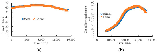 The accuracy of radar data was evaluated using Beidou satellite data. The differential positioning base station was used to improve the positioning accuracy of the Beidou satellite, which made the positioning accuracy within ±10 cm and the speed accuracy within ± 0.1 m/s. Figure 3a shows the speed comparison between Beidou and radar. The accuracy of vehicle speed collected by radar is 99.1%.